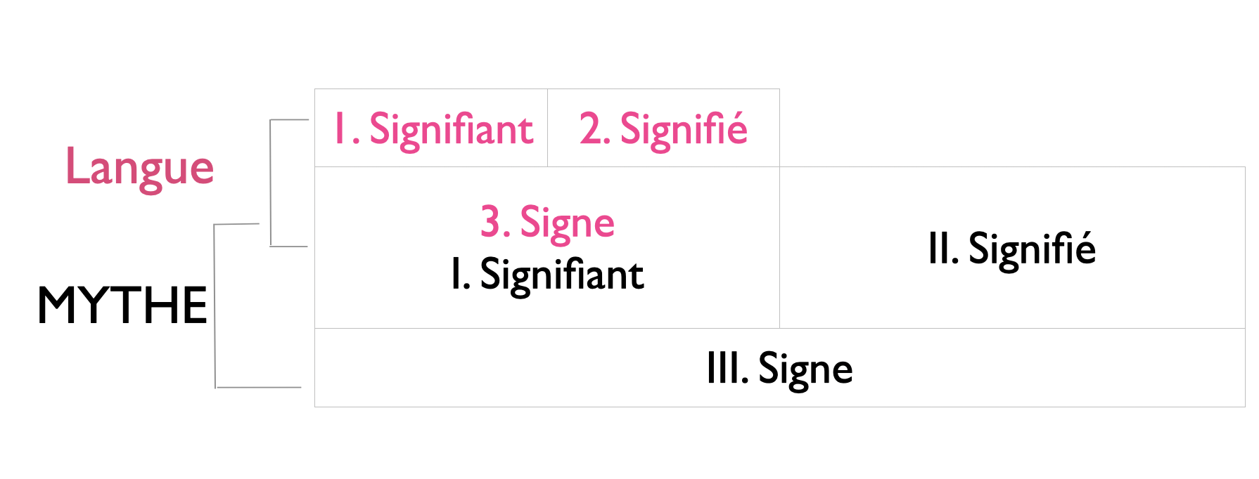 Plus précisément, il y a mythe lorsque la forme du premier niveau est utilisé comme Forme pour véhiculer un nouveau Sens ou nouvelle Signification. Voici le schéma canonique du mythe de Roland Barthes que l'on retrouve dans les Mythologies et l'Aventure Sémiologique.