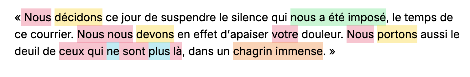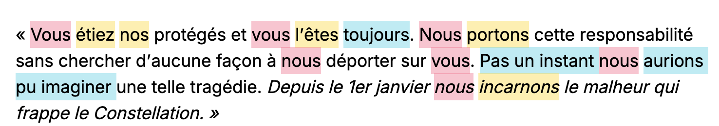 Seul le "votre douleur" est présent, en toute fin de phrase. Qui plus est, cet aspect fort émotionnel est totalement neutralisé par le "nous nous devons". Ici c'est donc la modalité du DEVOIR qui s'associe au champ lexical de l'APAISEMENT. "Nous nous devons en effet d'apaiser votre douleur". Ce sont deux champs lexicaux qui s'opposent ainsi... Or il aurait été sans doute plus délicat "d'incarner", "de vouloir", "de ressentir le besoin de", "d'entendre et comprendre", c'est-à-dire un champ lexical plus humain et empathique.